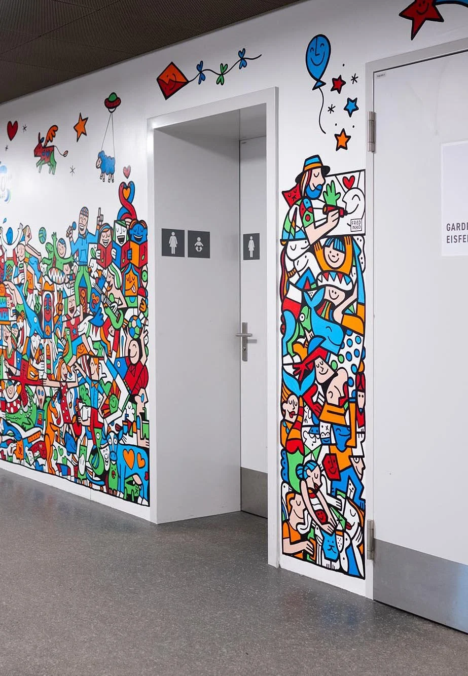 Und ART OF FREDINKO durfte einen Beitrag dazu leisten! Liebe bis ins Detail ganz ohne KI oder Systemschrift: auch der Schriftzug wurde von null auf handgezeichnet. Das Keyvisual und Teile davon sind überall im Letzipark anzutreffen; von der Geschenkkarte über das Grossplakat, den animierten Screens bis hin zu den Eisfeldbanden.