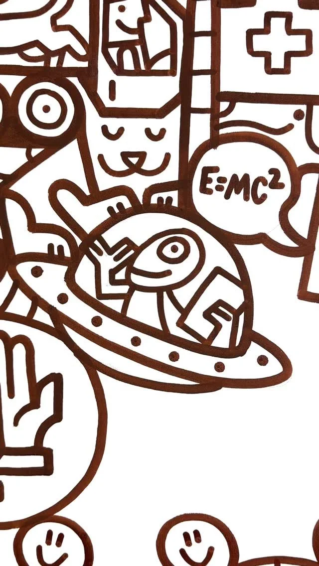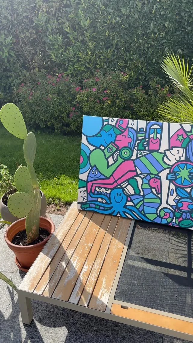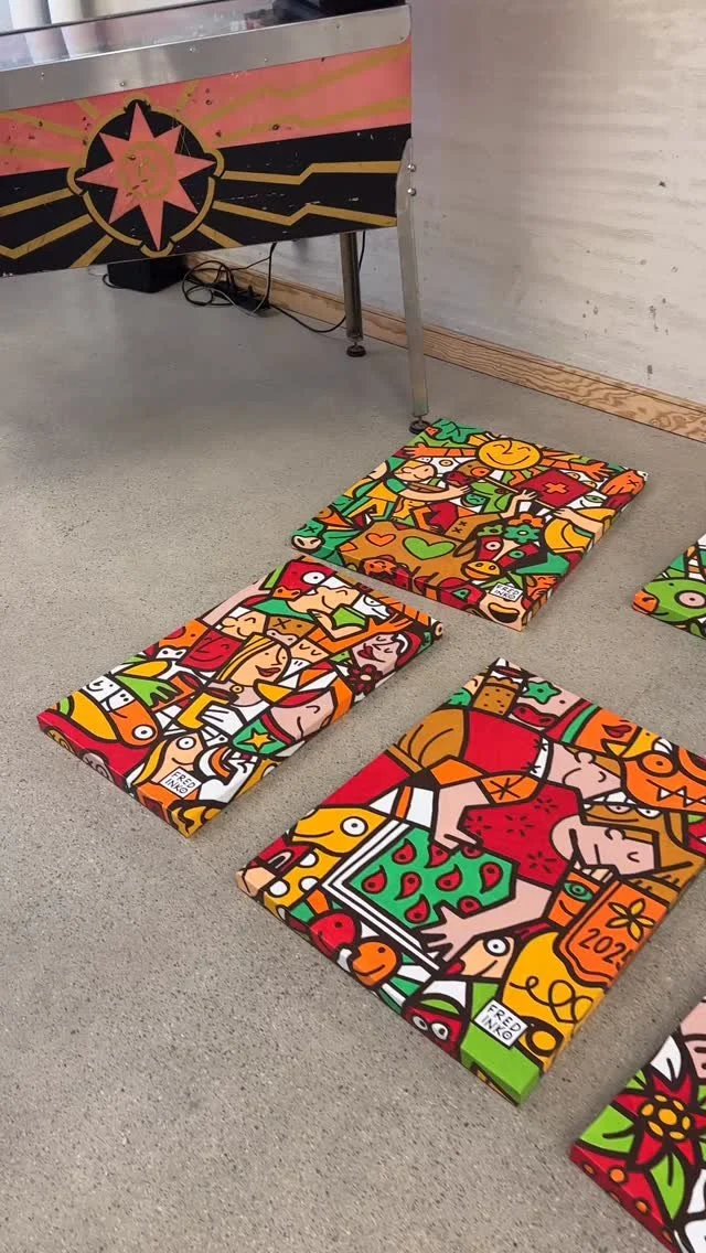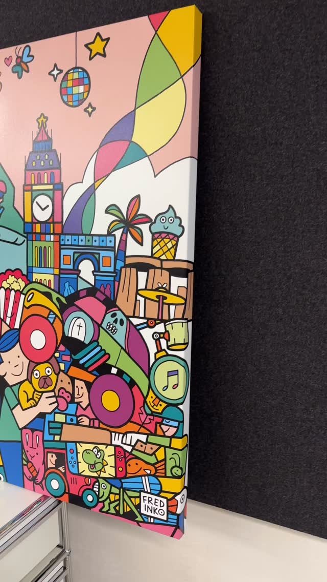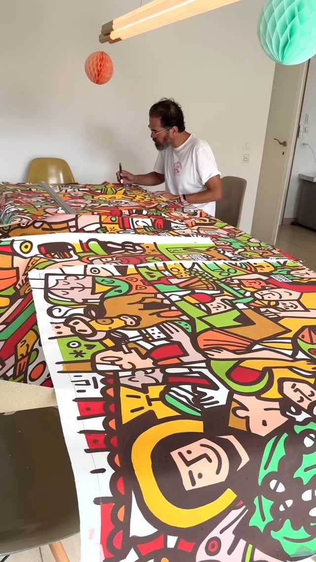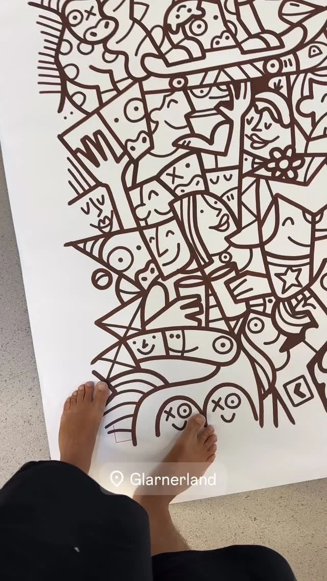 Fredinko is an artist, cartoonist and advertiser. He published his first cartoon at the age of 14. Since then, he has been fascinated by outlines and deadlines. In addition to his later work as an advertiser, he developed his style as an artist, which, according to his own statement, lies “between Pop Art and Neo-Cubism”. It arose from a father-son conflict of an artistic nature: the father, an architect of the old Bauhaus school, ordered to work with strict geometric shapes. Fredinko, a rebel by nature, fought back with an organic and free design language. The result is the combination of both, whereby the old conflict between chaos and strict order is sometimes more, sometimes less noticeable in his works. The Swiss with German-Hungarian-Slovakian roots became known through his live performances, where he decorates large screens with his unique drawings and lets the audience color in. Fredinko lives with his family in Adliswil, where he also runs his studio.